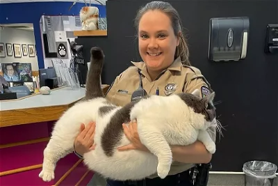 The animal control officer above is smiling, but the full picture shows her staggering under the weight of Patches. The 40.3-pound cat came into the care of Richmond Animal Care and Control with a serious case of overeating. Less than a day after the shelter posted his photo on Facebook, Patches was matched with a new owner who is committed to giving him a regimen of diet and exercise to get the cat down to a healthy weight. His new human, Kay Ford, had to have a second person help her carry Patches' cage out of the building. Ford promises to give Patches an Instagram account so that his fans can keep up with his weight loss journey.