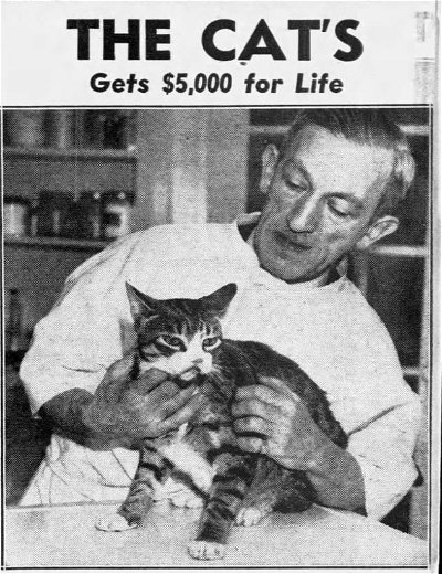 In 1935, Louise Baier of Washington Heights in New York City took in a stray kitten and named him Tommy Tucker, possibly after the famous orchestra leader of the day. Tommy was had some behavioral quirks and health problems, but Baier loved him. She was also an advocate for cats and cat charities. When Baier died in 1939 with no heirs, she bequeathed funds for several animal and children's charities, plus her housekeeper, and $5,000 for Tommy. In fact, she had spelled out exactly what was to become of Tommy. Baier had designated Dr. Henry L. Hirscher, Tommy's veterinarian who knew the cat well, as Tommy's caretaker. She also appointed a trustee for Tommy's funds, and instructions for the eventualities of Tommy's death or Dr. Hirscher's death. That seems like everything was covered, except for the fact that the judge in the probate case did not find it appropriate for a cat to inherit $5,000. Read the story of Tommy Tucker and his inheritance at The Hatching Cat. -via Strange Company ā