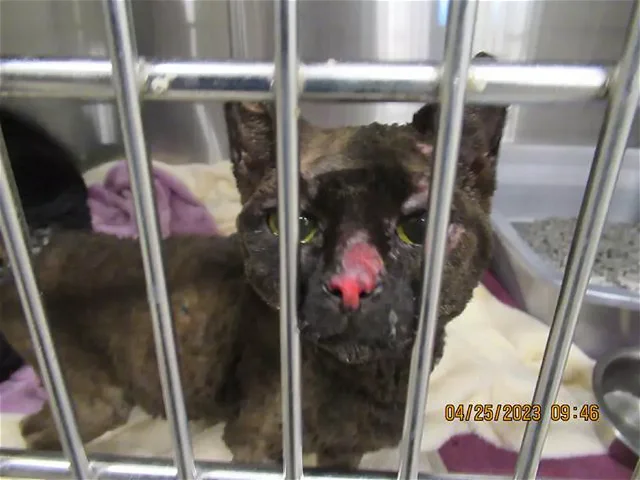 In April, there was a fire in downtown Phoenix. In the aftermath, a small black cat was found wandering with severe burns. She was taken to the Arizona Humane Society. Libby had burns on her paws, ears, and face. She was immediately given an IV for fluids, antibiotics, and pain relief. Over the next four months, Libby underwent a series of painful procedures, including the removal of some toes and debridement of skin and flesh as she started to heal. Finally, Libby was well enough to be placed in a foster home.