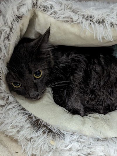 In a shocking act of cruelty, someone left a pillowcase on the side of the road with a cat tied up in it. A woman named Sara was driving by in the rain in Niagara Falls, New York, and saw the pillowcase move. She stopped and found a wet long-haired grey female cat inside, who immediately ran when freed. The cat sought shelter in Sara's car engine. She called authorities, and two SPCA officers retrieved the cat from the car engine. She was taken to the Niagara SPCA shelter and appeared to be unhealthy and uninjured, although scared and wet.