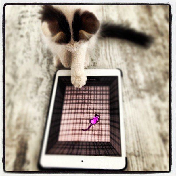 Lifehacker has a roundup of several downloadable games for cats with descriptions of each. These games will allow him to virtually hunt mice, catch fish, play with feathers, or just go crazy for a virtual laser light, among other activities. Cats can see flatscreens well, although you may have to turn the room light down to get his attention. Just be sure you have a screen protector on your device. Limiting screen time for a cat is not a big deal, since they don't have to get up early in the morning to catch the school bus.