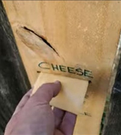 The fence has a slot cut into a slat that is the perfect size for a cheese single. The human becomes a vending machine with this simple device.