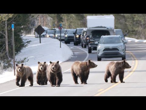 One of 399's survival tactics is to bring her cubs to hang out near highways. This may seen counterintuitive, but it keeps the cubs away from the more remote adult male grizzlies, which can be way more dangerous to cubs than moving cars. She teaches her cubs to look both ways before crossing the road. During tourist season, the sight of a mama bear and four cubs will stop traffic in its tracks.