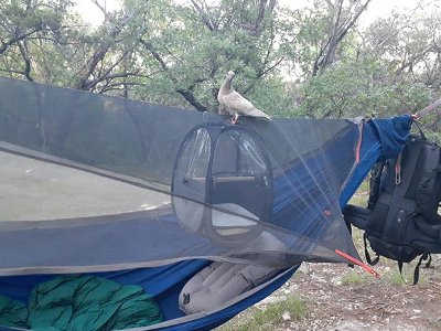 Joseph Mendoza is a horse trainer in Arizona. He loves those noble animals, but his bestie is Chip, a pigeon. They go camping together. Here is Chip perched on Mendoza’s hammock tent. Inside is a custom tent made just for Chip.
